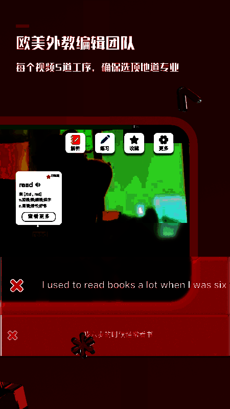 软件内设汉英对照功能,方便用户随时对照理解,查漏补缺;高效的中英切换机制强化听力训练,提高语言感知力。同时,点击查词与收藏功能让用户能即时积累生词,反复复习巩固记忆。多样化的互动学习形式也极大提升了用户的参与度,使学习过程更加生动有趣。