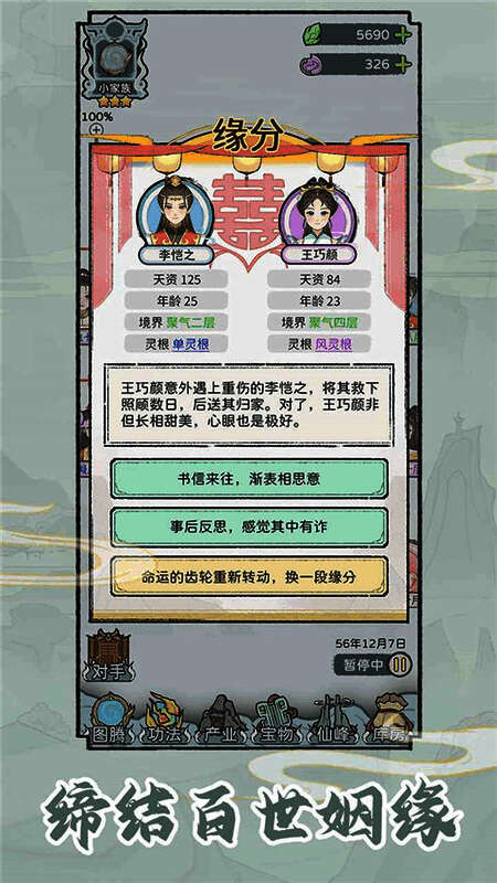 灵根与属性值的继承机制是游戏的核心之一。当前版本中,高资质父母所生子女未必能完美继承,因此建议加强天赋遗传比例,使传承更具意义。此外,战斗系统目前较为单调,未来可加入招式系统与行动条机制,提升战斗策略性与视觉表现力。