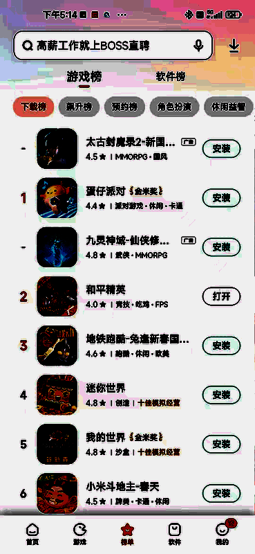 首次使用时,用户只需下载并打开小米应用商店App,在首页即可通过关键词搜索或浏览推荐内容查找所需软件。例如在“软件”分类中,可按教育、购物等标签筛选对应应用;点击进入榜单页面,则能查看当前热门游戏与软件排名。 选定目标后,点击“下载”按钮即可实现高速下载与自动安装,无需繁琐操作,大幅提升使用效率。 榜单页面则呈现了当前最热游戏与软件排行,帮助用户把握潮流趋势。