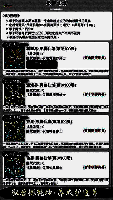 开发团队定期推出新版本更新,包括新增天骄战、仙魔入侵、星罗棋道阵、仙缘秘境等内容,并对现有系统进行优化调整。例如v6.15版本新增鸿蒙境界与虚无界,提升寿命上限与境界倍速,优化神器兑换与购买机制,增强灵兽感悟带来的加成效果,同时还加入了多种一键操作功能,提升整体游戏体验。