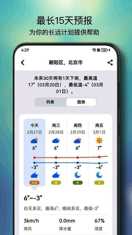 这款应用不仅提供温度、湿度、风速等基本天气数据,还能展示一周内的天气趋势分析,以及紫外线指数、空气质量等关键气象指标,真正实现对天气状况的全面掌控,是现代生活中不可或缺的智能天气工具。