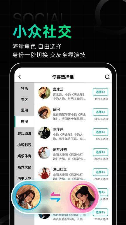 该应用的最大亮点之一是支持匿名社交模式,用户可以随时切换角色身份,在不同的社交圈子中自由穿梭。无论是扮演现代商界大咖,还是穿越到古代与历史人物“对打”,都能带来前所未有的沉浸式体验。此外,平台还设有自拍区、语音C圈、外域等多种特色区域,极大丰富了用户的互动形式。