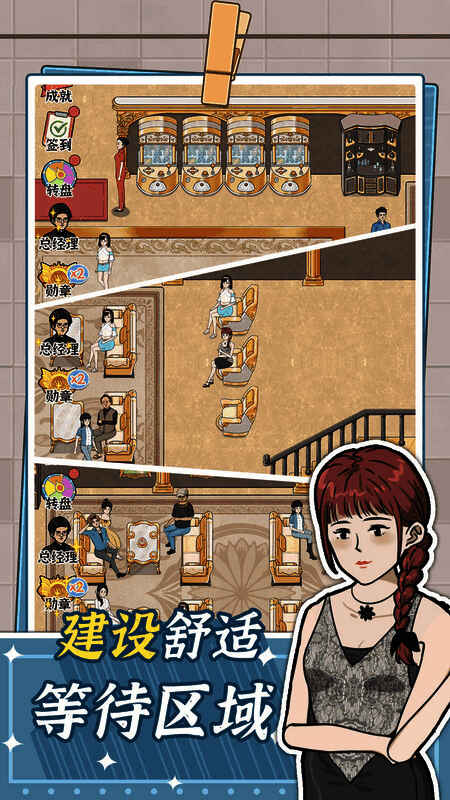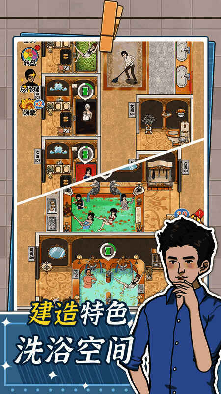 在《浴场之王免广告》中,玩家可以根据个人喜好自由搭配装修风格,无论是低调现代风还是奢华复古风,都能轻松实现。同时,游戏鼓励玩家大胆创新,推出如红酒浴、珍珠奶茶浴、石油浴等极具创意的洗浴项目,不仅能吸引追求新鲜感的顾客,还能提升浴场话题度与人气。