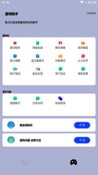 使用画质猫非常简单,进入首页后即可看到各类画质与帧率修改选项。向下滚动页面,点击“游戏助手”便可进入更多辅助功能区域,例如换处理器、调灵敏度等实用设置。