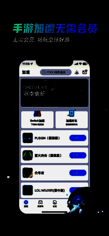 用户可通过【加速】、【找游戏】、【社区】、【话题】和【我的】五大模块快速找到所需功能。例如,在【加速】界面中,玩家可以搜索游戏、选择加速时长,并实时查看当前延迟与丢包率;在【找游戏】中,可浏览推荐、排行及分类游戏内容;而【社区】与【话题】板块则为玩家提供攻略、资讯交流平台。