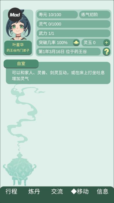 《药王谷女修修炼手札 全解锁版》是一款以东方仙侠为背景的文字类养成游戏。玩家将扮演一位踏入修行之路的少女,在神秘而古老的药王谷中展开属于自己的修炼旅程。游戏中不仅有丰富的剧情设定和成长系统,还融合了炼丹、战斗、社交等多种玩法,带来沉浸式的修仙体验。