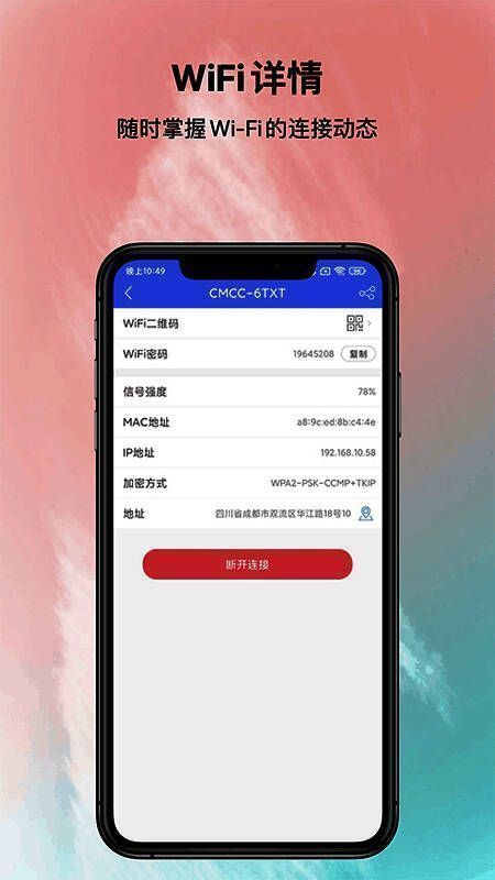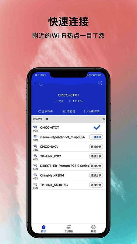 打开《邻里WiFi密码》,软件会自动扫描周边所有可连接的WiFi热点,并以列表形式呈现给用户。用户只需轻点所需热点,即可完成连接操作,无需手动输入繁琐密码,极大提升了使用效率。