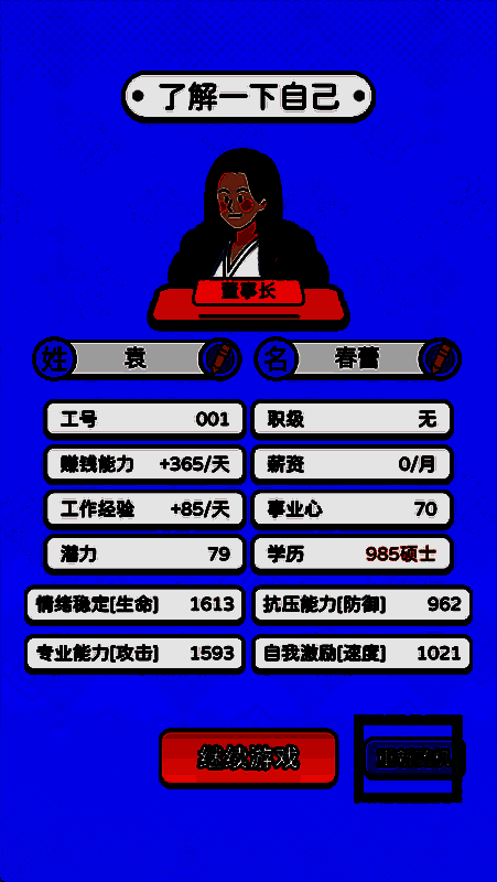 初次进入游戏时,请先设置好个人基础属性,如果对当前数值不满意可以选择重新生成。接下来为你的公司命名,这一步非常重要哦!因为一个好的名字往往能给人留下深刻印象。