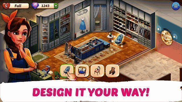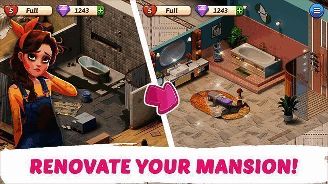 游戏采用经典的Match-3消除机制作为推进主线的核心方式,每完成一关即可获得“星星”,用于解锁装修进度,例如清理大厅、粉刷墙面、添置家具等。随着剧情推进,你将逐步修复住宅区域、图书馆、厨房、花园、网球场等多个空间,每一处都充满个性与创意。