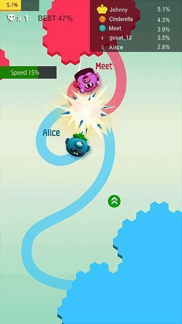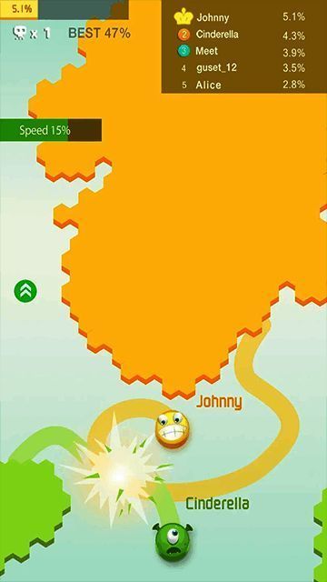 进入游戏后,玩家只需点击屏幕即可控制角色移动,随后通过精准操控画出属于自己的领地边界。值得注意的是,在圈线未闭合之前一旦触碰到敌人身体或其圈线,就会立即被淘汰出局。因此起步阶段建议采用小圈慢扩的方式,优先清理边缘区域确保安全后再逐步推进。