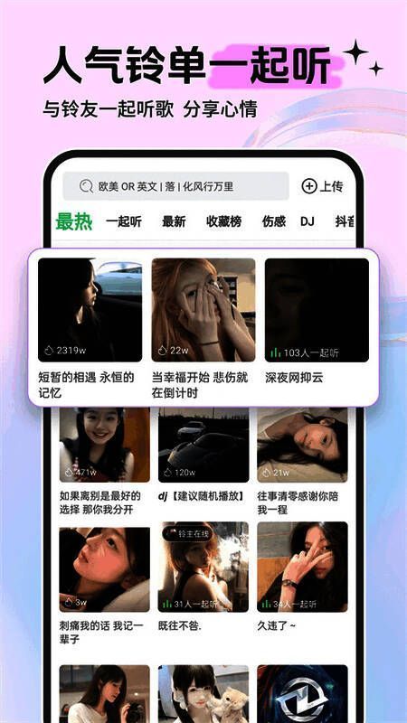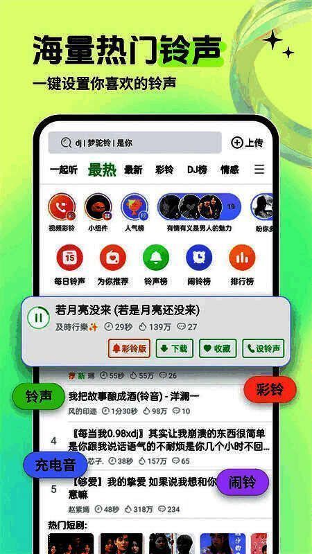 该软件拥有极其庞大的曲库资源,涵盖流行歌曲、影视广告、动漫游戏、DJ舞曲、搞笑另类等多种类型,满足不同用户的多样化需求。无论你是追剧达人、音乐控还是喜欢搞怪风格,都能在这里找到专属铃声。更有用户自发上传的原创或热门短视频配乐,让铃声内容持续更新,紧跟潮流趋势。