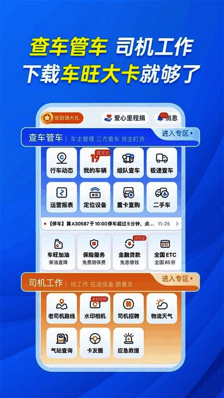 车旺大卡历史版本具备多项针对卡车行业的特色服务。其中包括专为卡车设计的导航系统,可智能规避限高、限宽和限重路段;实时追踪卡车位置,确保运输过程尽在掌控;搭载kcal水印摄像头记录货物状态,保障运输安全;支持车辆违法查询,提供免费检测服务;更有智能车辆管理功能,成为企业车队管理的好帮手。