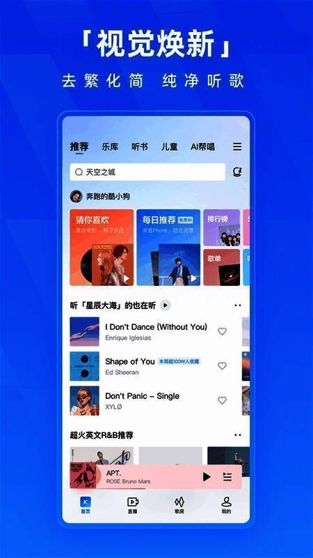 酷狗音乐网页概念版的一大亮点是其“手提电话KTV”功能,拥有超过300万首伴奏资源,涵盖录音室、KTV、音乐厅、演唱会等多种场景音效。通过VIPER音频渲染技术,用户的声音可以得到自然、专业的处理,仿佛置身于专业录音棚中。无论是日常练歌还是与好友对唱,都能轻松实现高质量的K歌体验。