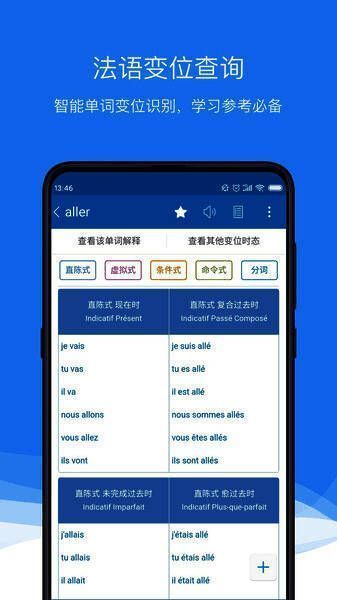 3.法语动词变位查询,提供18种时态动词变位的反向查找功能;
