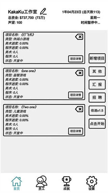 游戏的核心玩法围绕创业、团队建设、项目管理和策略经营四大模块展开。从最初为你的工作室命名并选址设立办公地点,到逐步搭建起完整的开发团队,每一步都需要精心规划和合理安排。你可以通过多种渠道招聘拥有不同专长的员工,例如注重效率的速度型人才、擅长技术实现的技术型成员以及具备创意灵感的策划人员。