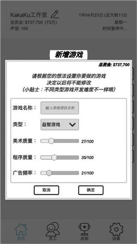除了基础的运营与管理,《游戏开发模拟》还引入了技能成长系统。随着游戏进程的深入,玩家可以提升速度、技术、创意三大核心能力,解锁更高级别的成就任务和挑战内容。这种成长机制不仅增强了游戏的可玩性,也让玩家在不断学习和优化中感受到真实的成就感。