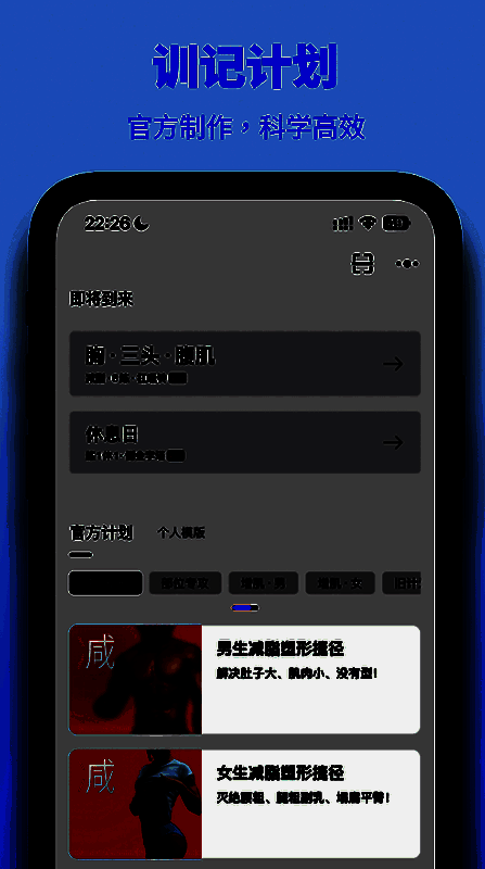 2.随时随地启动训练模式,支持离线训练和采集功能,课程时间短至4分钟,可匹配各种健身场景。