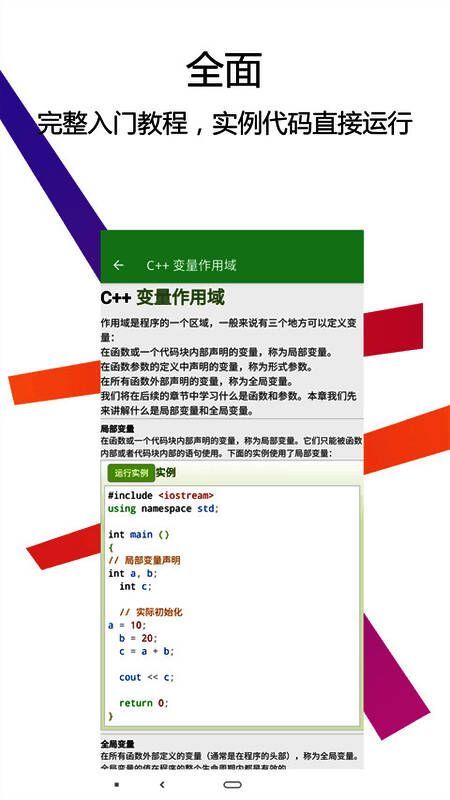 C++编译器 手机版是一款专门为想学习C++的人设计的C语言学习软件。该软件包含从初级到高级、从简单到复杂的学习教程,因此随时随地学习和编译都非常方便。它是专门为需要学习C++代码编写和编译的C语言IDE的用户设计的。它包含了很多基础和高级内容,适合初学者。只需安装此软件,您就可以直接在手机上编写和编译,您可以享受完整的C++入门级教程,而无需其他冗余的安装工具,帮助您轻松学习编写各种代码!