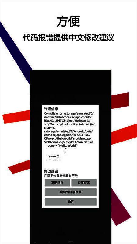3.编写和报告错误的中文提示。在编译和报告错误时提供中文提示,并支持直接跳到错误的位置,以便于学习和理解。