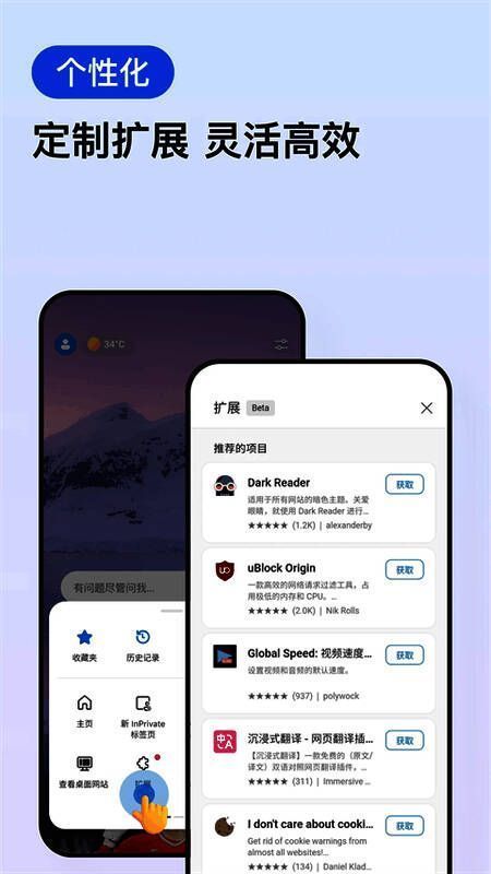 edge浏览器 手机安卓版是新一代移动浏览器。目前,它已经完全登陆iPhone和Android手机,并在国外拥有一定的用户群。现在,Edge浏览器已经能够支持跨平台数据同步。存储在计算机Edge浏览器中的所有数据都可以通过网络同步到移动设备,这样您的收集和浏览记录就可以跨平台使用。它还提供了一系列保护在线隐私的工具,并具有防跟踪、AdBlock Plus和InPrivate模式等功能。允许您以有序的方式组织网页,使您随时随地更容易查找、查看和管理内容。具有出色的兼容性、出色的性能和全新的功能,是一款可以满足您各种需求的浏览器。更多的隐私保护,更容易控制,更高的工作效率和巨大的价值。随时随地浏览,从手机到电脑和其他登录设备,享受无缝体验。