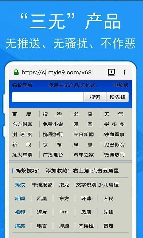 蚂蚁浏览器 手机安装入口是一款实用且兼容的IE内核浏览器。首先,与其他浏览器相比,它具有浏览响应快、无干扰、能够识别恶意网站、随时换肤等特点。重要的是安全性高,由公安局备案,不窃取隐私,不带广告,用户可以放心浏览任何网页。此外,它还配备了mozilla网络引擎,使用户浏览速度更快。此外,蚂蚁浏览器官方免费版中还有视频和新奇资源,所有这些都可以免费观看和阅读。此外,该软件还具有无缝浏览模式,因此用户可以安全地访问页面并观看整个过程,而无需任何记录。同时,该软件在节流方面也非常强大。