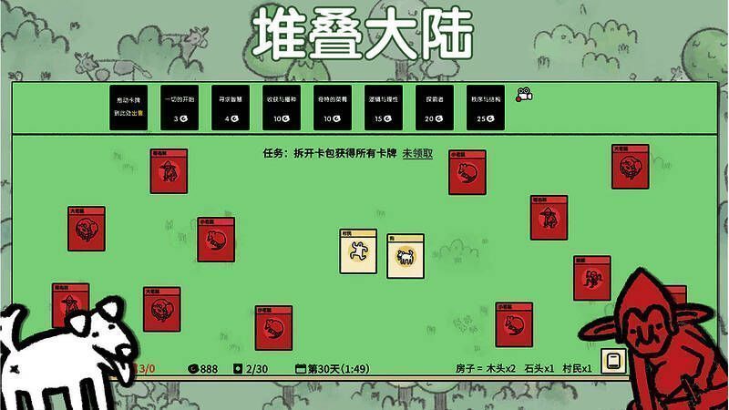 游戏中的所有元素都以卡牌形式呈现,玩家通过将不同卡牌进行堆叠和组合来产生新的卡牌或触发各种操作。如将“村民”卡牌拖到“树木”卡牌上可获得“木材”和“树枝”,将特定数量的“木材”“石头”与“村民”组合能建造“房屋”等建筑。
