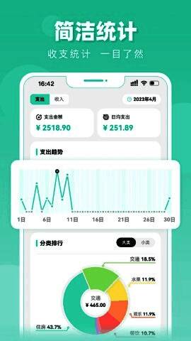 2.直观的统计图表:提供曲线和条形统计图表,清晰显示日常消费变化;