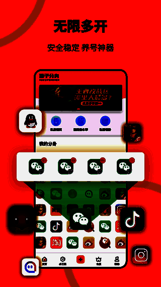无尽分身2025最新版是一款专业级的多应用分身工具,集高效、安全与便捷于一身。它不仅支持微信、QQ、陌陌等主流社交软件的双开功能,还兼容游戏、购物等多种类型的应用,让用户轻松实现一部手机多账号同时在线的操作需求。该软件基于官方正版技术开发,确保了极高的兼容性与稳定性,在运行过程中不卡顿、消息不延迟,且有效避免账号封禁问题。