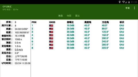 GPS测试是一款专业且用户友好的移动定位测试工具,支持四种类型的定位和导航:美国GPS、俄罗斯GLONASS、日本QZSS和中国北斗。它帮助系统工程师、开发者、普通用户显示实时卫星信息,包括纬度、经度、修复时间、初始耗时、高度、定位精度、速度、定位方向、日出、日落、UTC时间等。还提供基于Google Play服务的详细地图信息,充分满足不同用户的需求。精致、强大、灵活,如有需要请下载。
