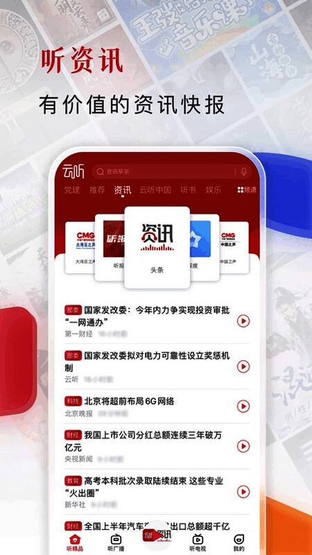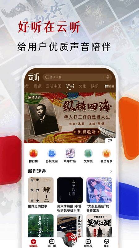 云听app旧版本是一款非常受欢迎的免费听书阅读软件,可以为用户提供各种热门小说图书,电台FM,评书等丰富资源,可以自由选择查看,轻松让用户自由听书阅读,还会实时更新各种精品小说,热门图书等类型,随时让用户免费阅读最新的小说内容,能完全满足用户的所有阅读需求,还具有智能推荐系统,随时随地自由查看用户的阅读历史记录,轻松推送各种精彩的小说,自由在线阅读感兴趣的小说书籍,有兴趣的用户欢迎下载。