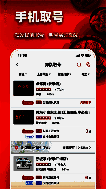1.热门餐厅排起了长队,现场排队占用了时间!与同事和亲戚共进晚餐,在家、办公室和任何地方选择餐馆,而无需等待应用程序,在网上排队,在商店吃饭。