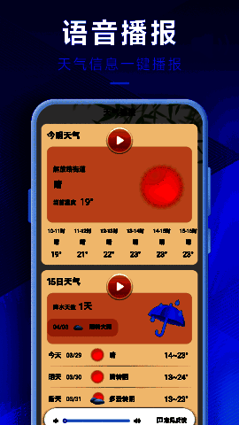 3.便捷的语音播报:利用真人语音播报功能,将天气信息生动有趣地传递给用户,用户都可以轻松获取天气状况,增强用户体验;