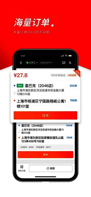 接单时在达达秒送骑士APP中抢单,注意核对餐品并及时送达,遇到异常报备,服务分保持60分以上。