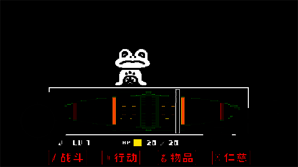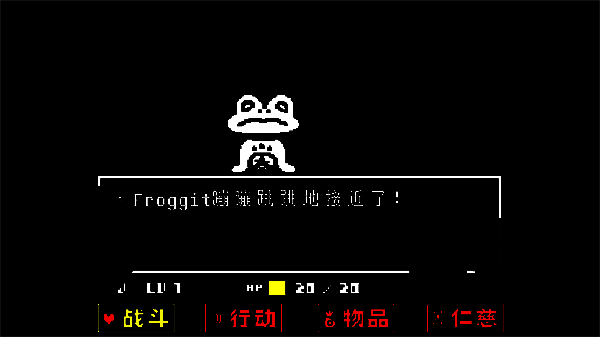 4、去到北面的藤蔓房间内会遇到青蛙froggit,选择“行动——赞美”,虽然青蛙不知道你在说什么,但他变得很开心,他就会逃离战斗。在右面的水池上有一个尖刺陷阱,Toriel会牵着你的手通过这个陷阱区域。