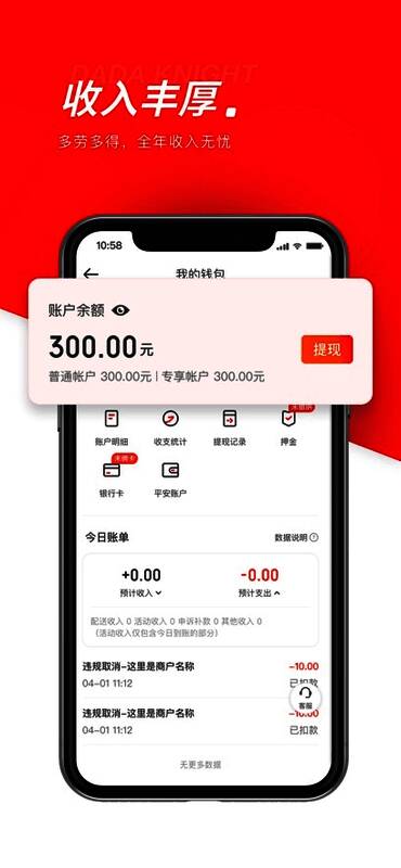 提供多维收入分析面板(单笔配送费、激励奖金、补贴明细),同步展示提现记录与账户余额动态。