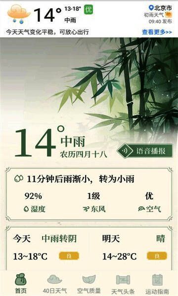 初雨天气无广告版是一款高人气的免费天气查询软件,拥有非常智能且精准的天气查询模式,可以自由显示当初城市地区和街道的详细天气状况和变化,还可以及时获取各时间段的天气状况,温度,PM2.5,空气质量等信息,随时让用户自由了解查询,能完全满足用户的使用需求,还支持语音播报功能,可以轻松播放最新的天气信息数据,还可以实时更新15天的天气,方便用户轻松自由出行,给用户带来便携的天气查询服务和体验。
