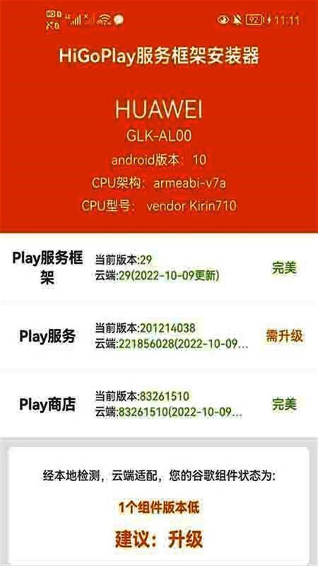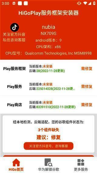 1、下载安装后打开HiGoPlay服务框架安装器华为解锁谷歌专用版,进入首页可以看到自己的手机信息。