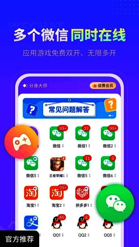 自主开发的具有多化身功能的应用程序,更稳定的微信多化身宝和助手,满足企业、游戏玩家、微信商家等群体对微信多头像的需求。完全支持微信、QQ和游戏等所有应用程序的无限制克隆打开。