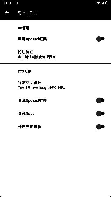 5、当然了如果你有需要,那么你可以在设置页面中,开启隐藏XP框架、隐藏ROOT以及开启守护进程。