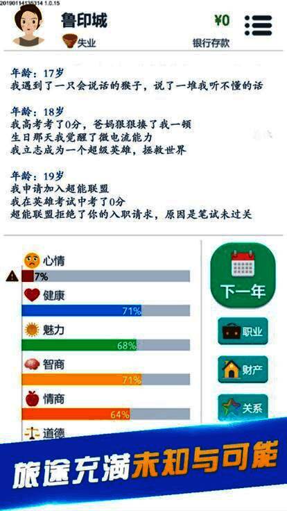 游戏采用简约的2D卡通画面结合详实的文字描述,将复杂的人生百态清晰呈现,易于上手却内涵深刻。这种设计风格既降低了操作门槛,又保留了丰富的叙事层次,使玩家能够更好地沉浸在角色的成长过程中。
