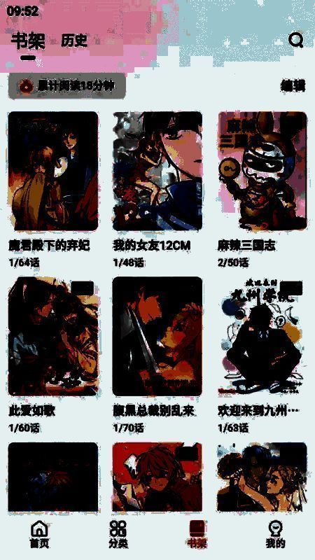 1、登录软件后可通过分类或是搜索来找到感兴趣的作品,并点击进入,在作品页面下方的“书架”