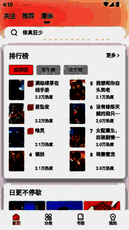 3、每日更新推荐:每日精选热门漫画进行推荐,让用户第一时间发现最新大作。