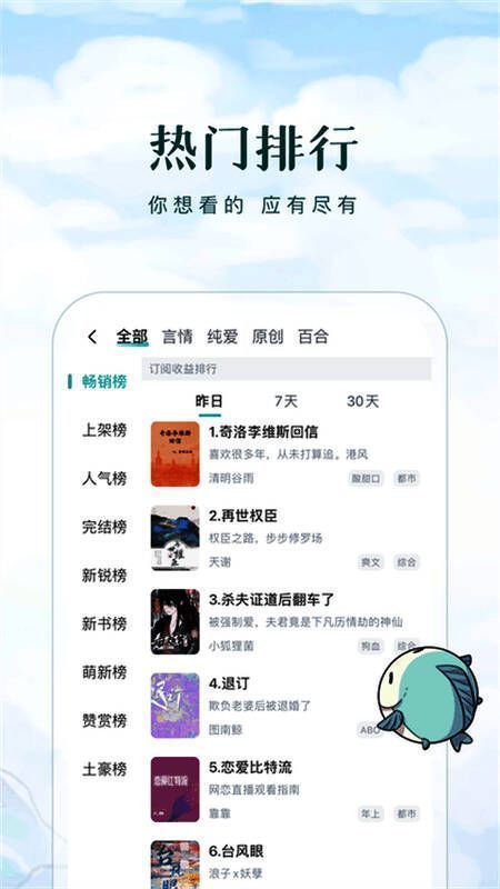 该应用汇集了来自全网的大量优质小说资源,涵盖浪漫、穿越、幻想、都市、青春、校园、总裁、美文、同人、官场、励志、武侠、科幻、历史、军事等几乎所有主流小说类型,真正实现“你想看的这里都有”。同时设有热门排行榜,根据点击量和搜索热度进行实时更新,帮助用户快速找到高人气作品,告别书荒困扰。
