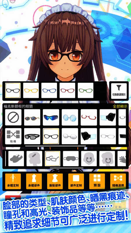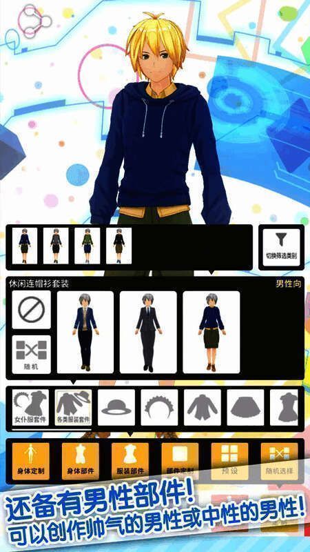 3、进入定制界面,身体部件、服装部将、部件定制、预设和随机选择等选项,可以根据自己的喜好设计出想要的角色模型,
