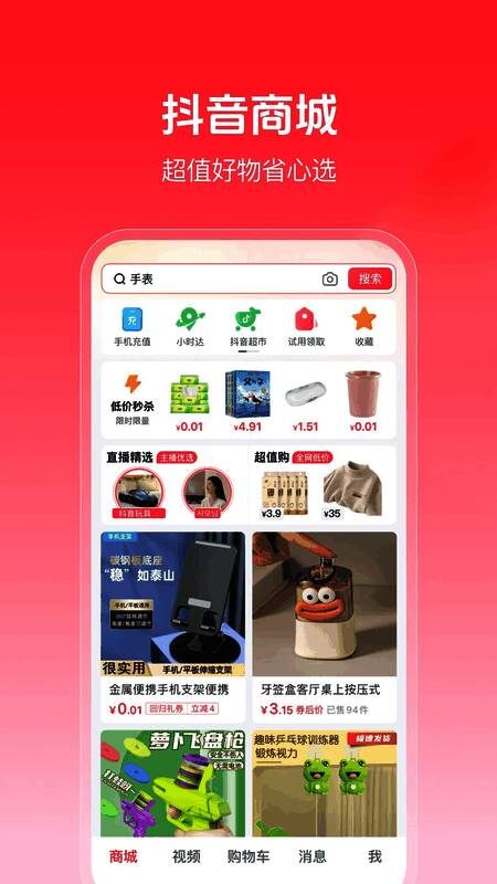 抖音商城app下载安装免费正版是一款很多人爱用的在线购物软件,拥有丰富多样的商品资源可以查看,随时让用户轻松购物,还具有购物车,搜索等各种功能,自由让用户领取各种购物优惠券,轻松在里面购买低价正品的商品,能完全满足用户的所有购物需求,还内置安全的支付环境,可以轻松在线购物,轻松让用户的每一次购物都成为明智选择,不仅让你买到好东西,还无形中为你节省了大量的开支,享受购物带来的满足和乐趣。