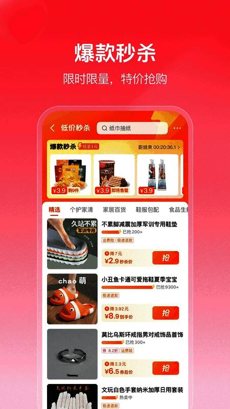 1.超低价格秒杀、惊喜:定期推出多项限时秒杀活动,涵盖各类热门商品,顾客只需手快眼快,即可轻松买到特超值商品;