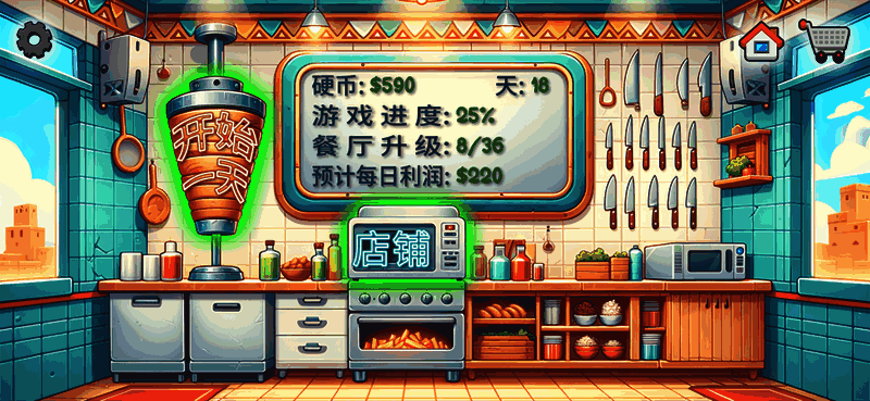 首次进入游戏后,首先选择适合自己的语言版本;点击进入游戏主菜单后选择“进入”按钮进入餐厅界面;接着点击“开始一天”,正式开启每日营业流程;准备好所需食材后,按照顾客订单依次完成沙威玛的制作与交付,从而获得金币奖励。