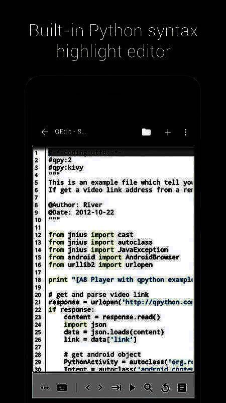 QPython3手机版通过社区支持,使用户能够共享经验、交换代码和解决问题。不仅是软件,还是为编程爱好者提供广阔开发空间的社区。无论您是新手还是经验丰富的开发人员,QPython3手机版都能满足您的需求,使您能够轻松掌握Python编程,开始编程旅行。来下载QPython3手机版,开始Python编程之旅!特别注意:整合和拓展了安卓库的脚本层(SL4A):它能让你用Python驱动安卓工作。