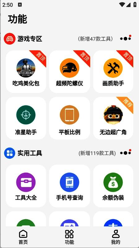 软件也有独特的游戏区、实用工具、吃鸡美化包、画质助手、工具等等一应俱全。