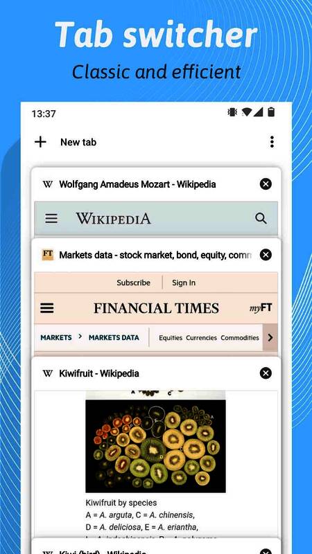 Kiwi浏览器还支持同时打开多个选项卡,支持无痕浏览。 除了页面翻译、下载管理、书签同步、历史、页面搜索等常用功能外,还内置多种主题和夜间模式,功能丰富,欢迎您体验自行下载。